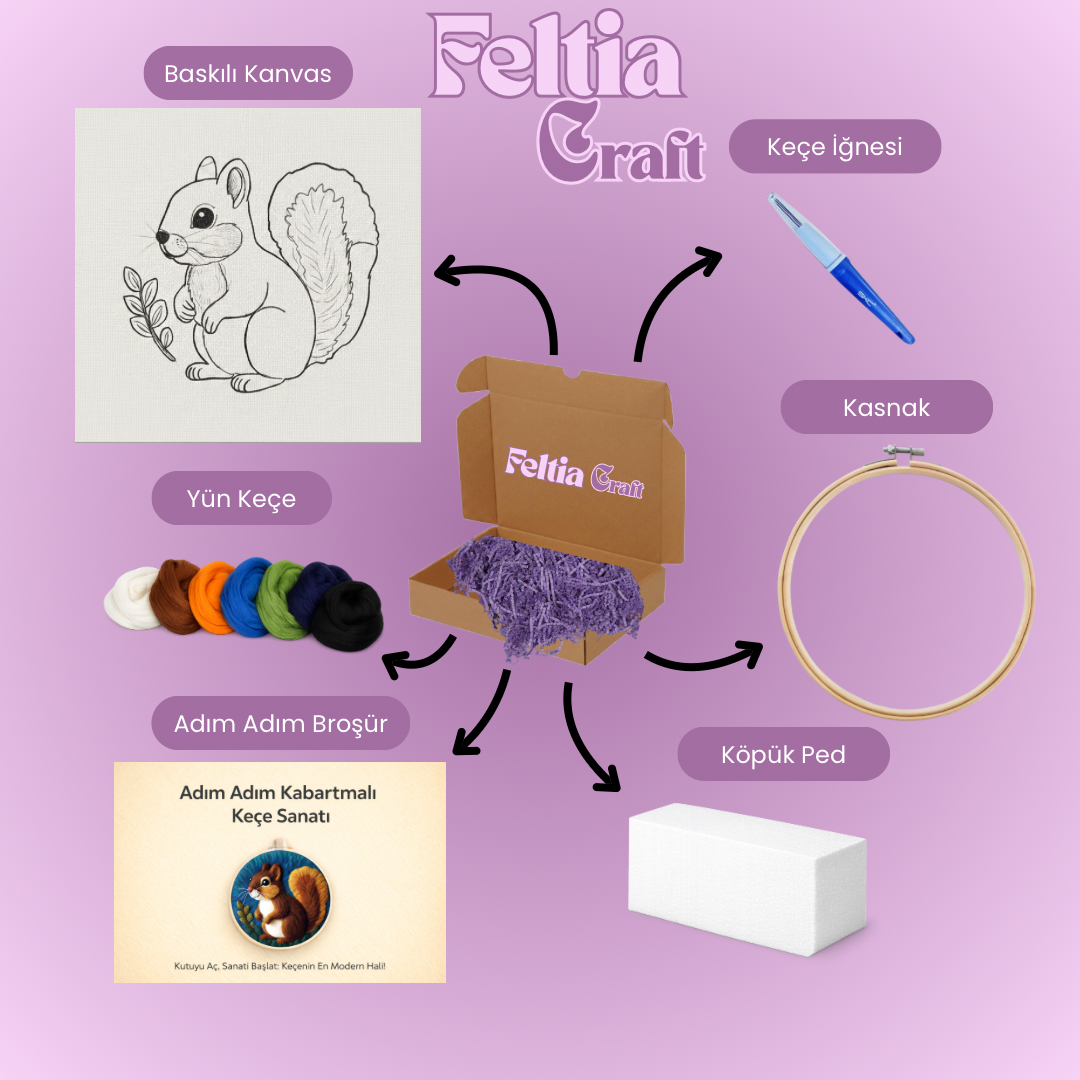 Kesinlikle. Her set, hemen başlamanız için gereken her şeyi içeren eksiksiz bir pakettir. Doğru renklerde ve miktarlarda yün keçe, keçe iğneleri, keçe pedi, kullanım kılavuzu ve size yol gösterecek net hatlara sahip önceden çizilmiş bir keçe kumaşı alacaksınız.